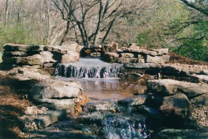 Water from the falls box flows into the upper pool, which in turn flows into the stream. Both the falls box and the upper pool can be loaded with plants to act as a biological filter. Although this water feature is in the shade, there are aquatic plants that will perform well here. Some of the plants we would recommend in this situation are listed on the page titled 'Water Plants for Shady Ponds.'